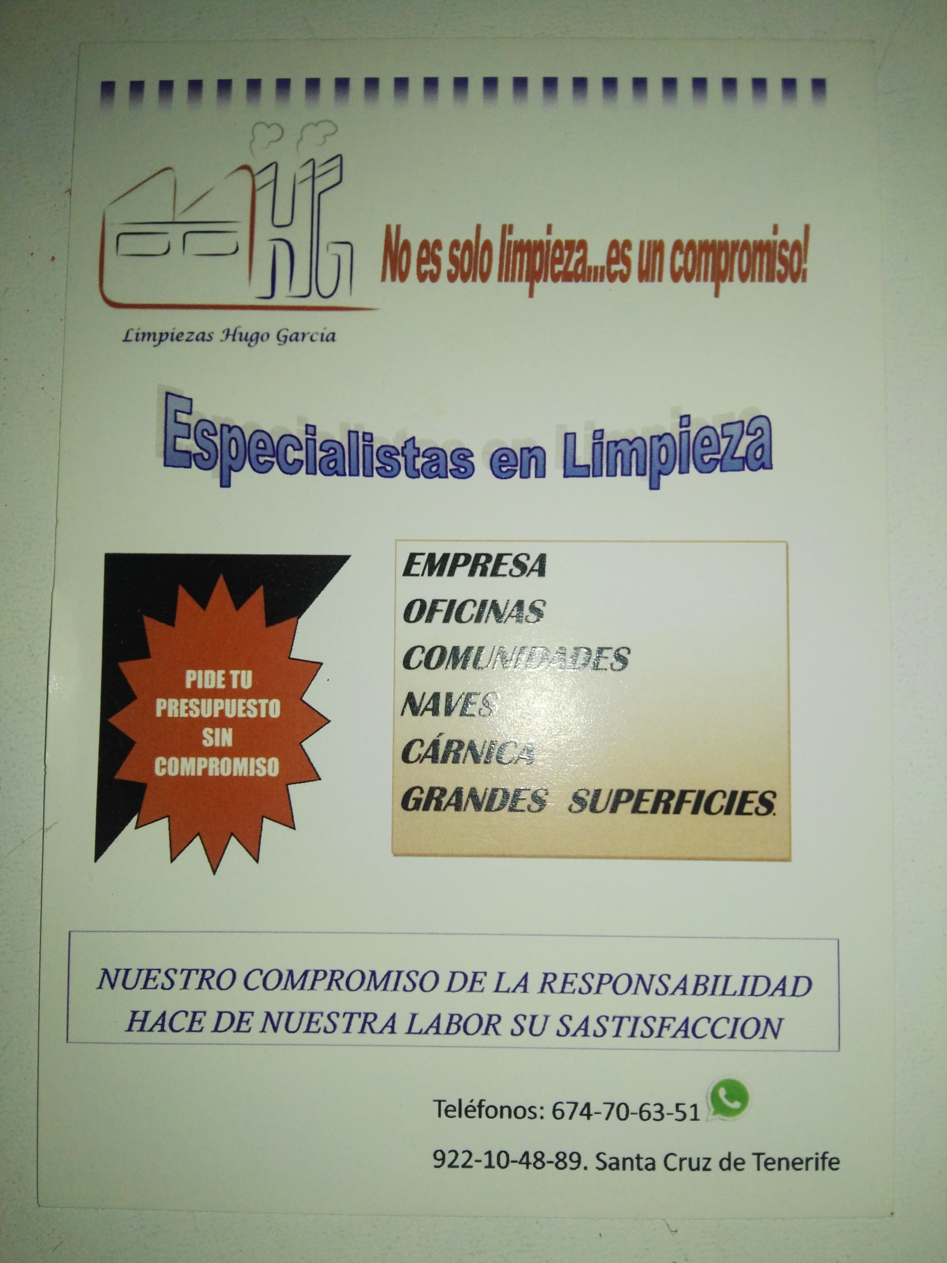 (Ver menos)Nuestra empresa, con más que 20 años de experiencia en la limpieza de comunidades, oficinas, y centros comerciales en el mercado de Tenerife, especializado en limpieza de alfombras, sófas y suelos, ofrece a nuestros clientes un trato cercano y un servicio de excelente calidad