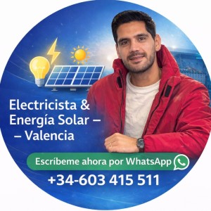 Electricista profesional en Valencia. Realizo reparaciones eléctricas, instalación de lámparas, enchufes, cuadros eléctricos y solución de averías. También trabajo con energía solar: instalación, mantenimiento y reparación de sistemas solares. Puedes enviarme tu problema por WhatsApp y te orientaré gratis.